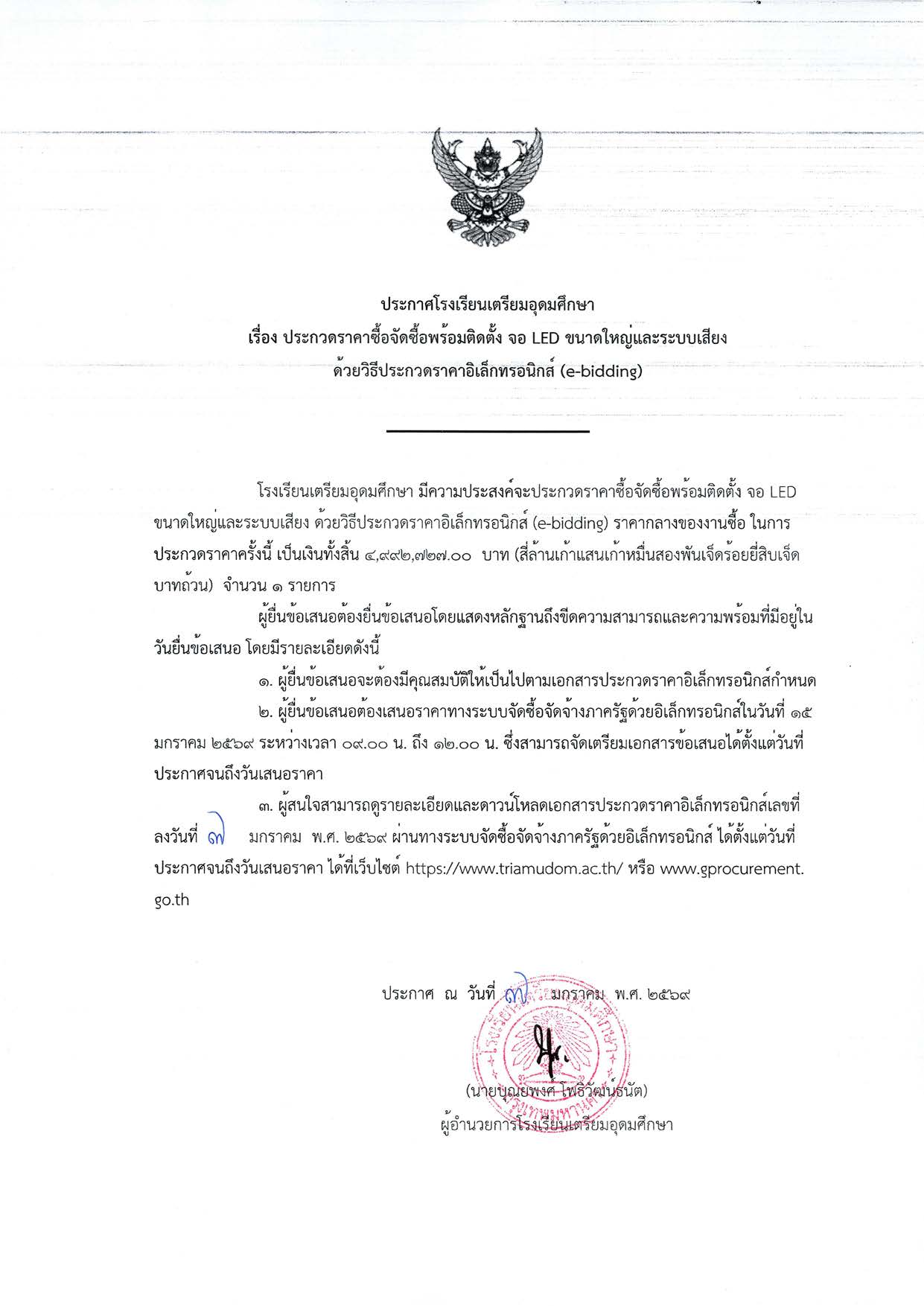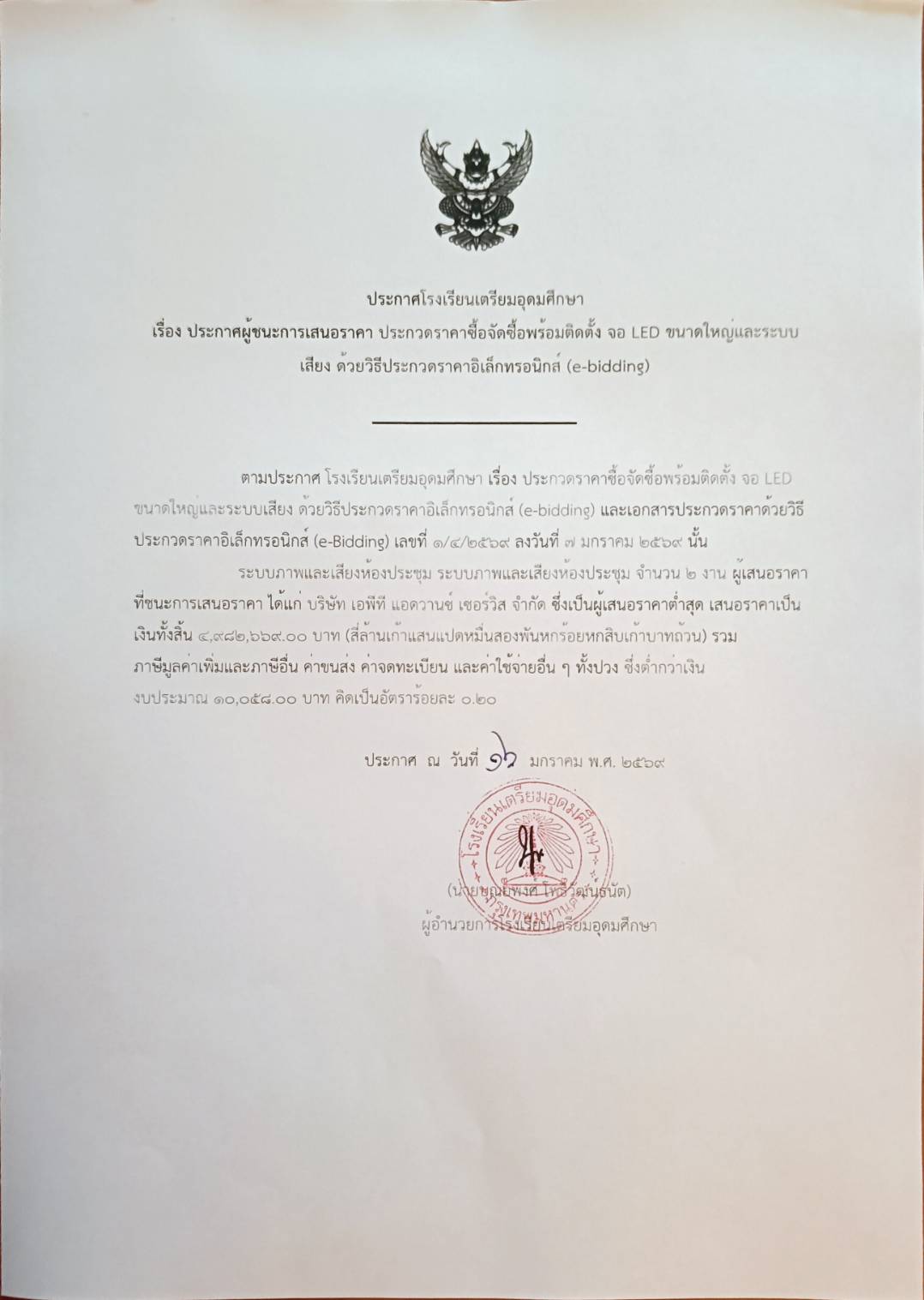 ประกาศผู้ชนะการเสนอราคา ประกวดราคาซื้อจัดซื้อพร้อมติดตั้ง จอ LED ขนาดใหญ่และระบบเสียงของโรงเรียนเตรียมอุดมศึกษา ด้วยวิธี e-bidding
