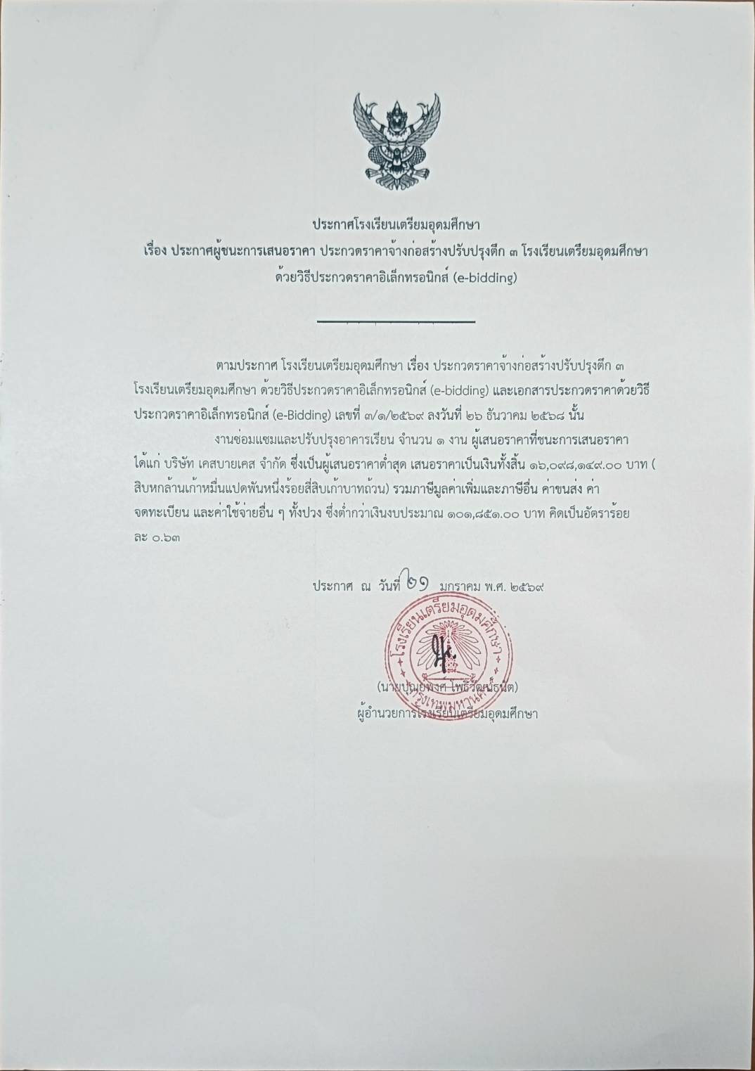 ประกาศผู้ชนะการเสนอราคา ประกวดราคาจ้างก่อสร้างปรับปรุงตึก 3 โรงเรียนเตรียมอุดมศึกษา ด้วยวิธีประกวดราคาอิเล็กทรอนิกส์ (e-bidding)