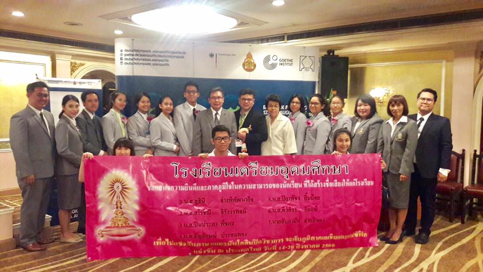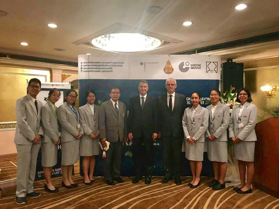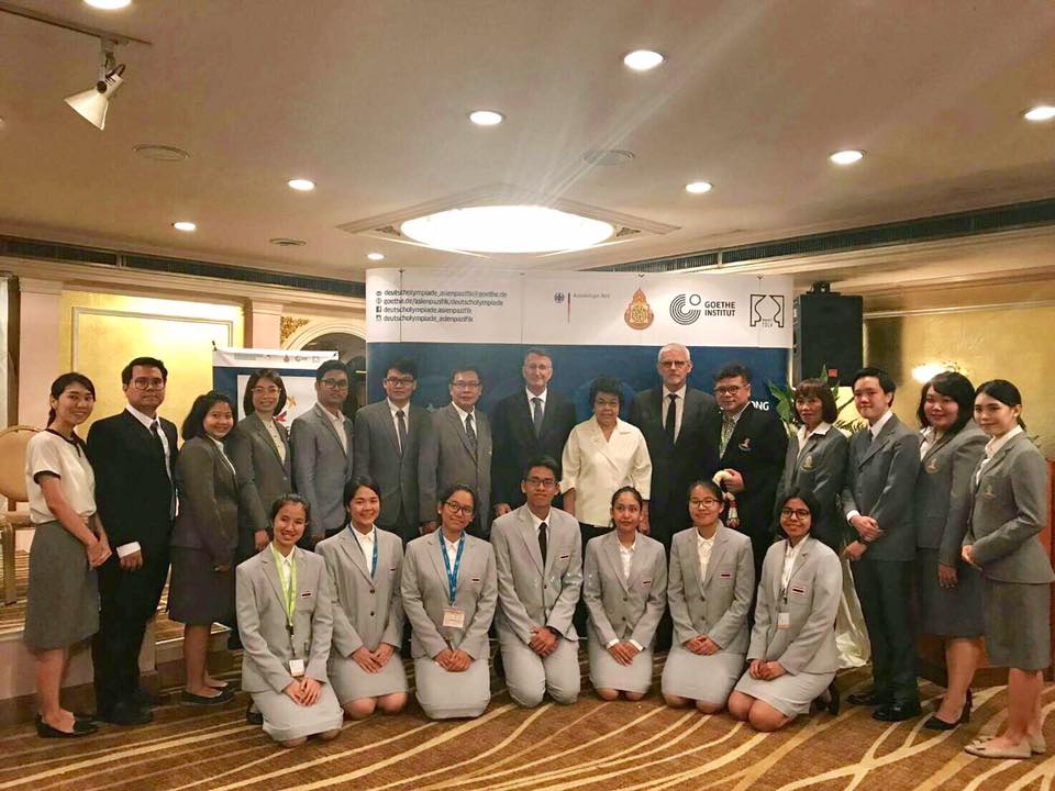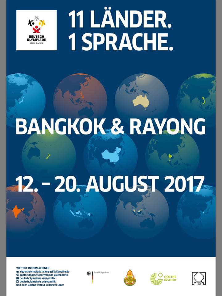 ขอเชิญชวนร่วมส่งกำลังใจ ให้ผู้แทนประเทศไทยจำนวน 14 คน ในการแข่งขัน ภาษาเยอรมันโอลิมปิก ระดับอาเซี่ยนและแปซิฟิก ซึ่งประเทศไทยเป็นเจ้าภาพจัดการแข่งขันระหว่างวันที่ 12 ถึง 20 สิงหาคม 2560 ณ กรุงเทพฯและจังหวัดระยอง ด้วยความร่วมมือกันระหว่างกระทรวงการต่างประเทศ ประเทศสหพันธ์สาธารณรัฐเยอรมนี ศูนย์พัฒนาการเรียนการสอนวิชาภาษาเยอรมัน โรงเรียนเตรียมอุดมศึกษา สำนักงานคณะกรรมการการศึกษาขั้นพื้นฐาน สถาบันเกอเธ่ ประเทศไทย และสมาคมครูภาษาเยอรมันในประเทศไทย